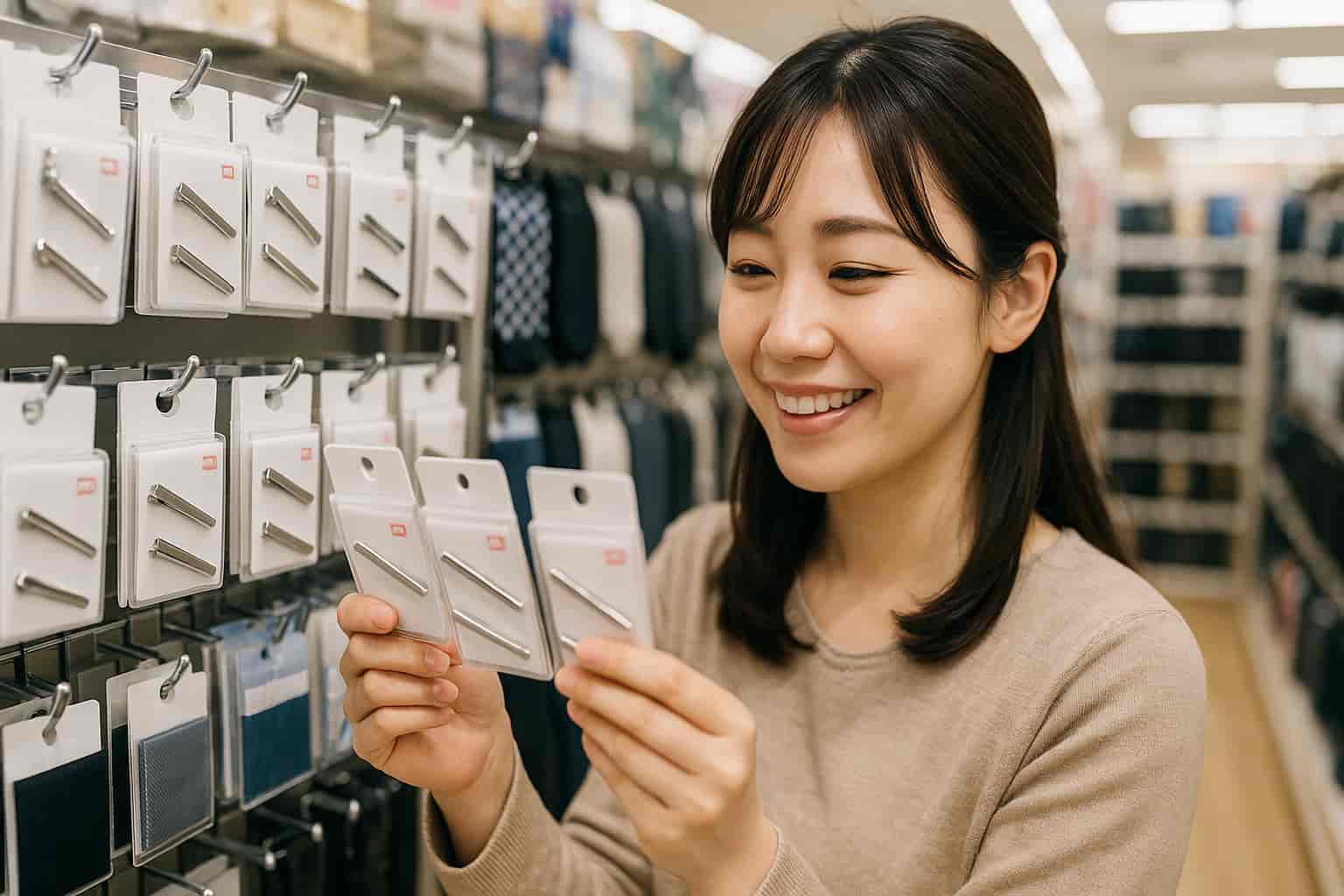 ダイソーでネクタイピンを探すときは、まず文房具や雑貨ではなく、衣料品コーナー周辺を目指すイメージを持つと、ぐっと見つけやすくなります。