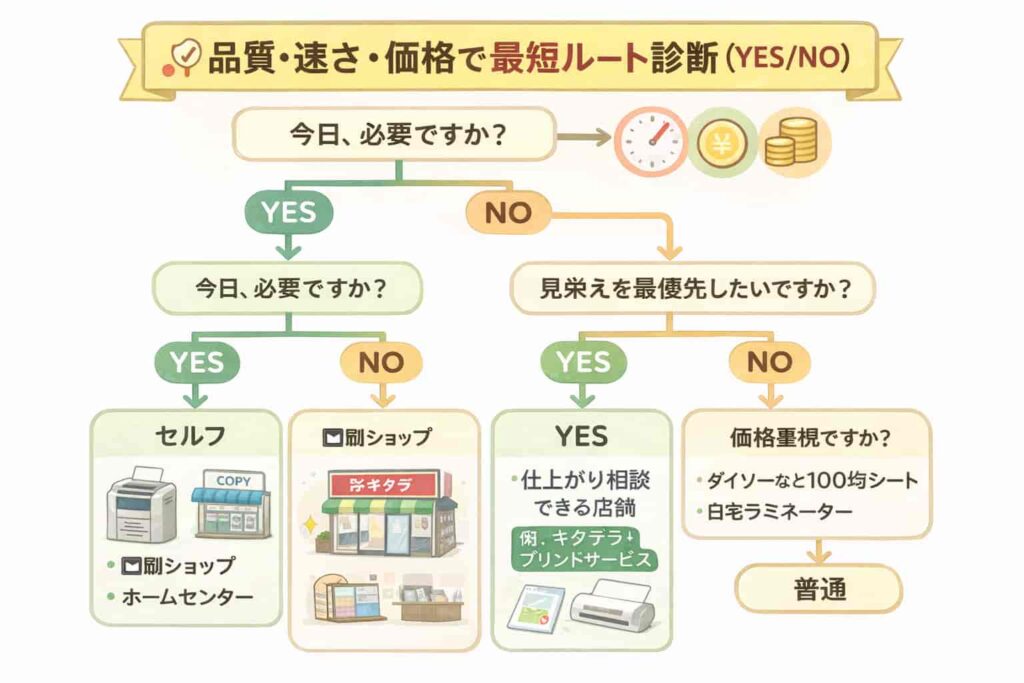 急ぎならセルフ機のある印刷ショップやホームセンターが候補になり、待てるなら相談しやすい店舗も選べます。