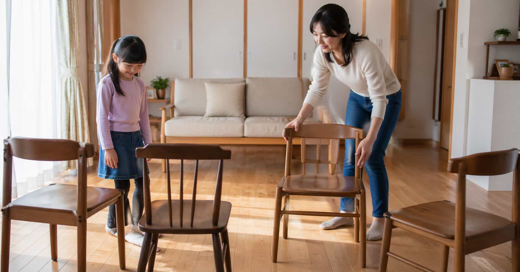 大人の集まりでも、椅子を斜めに置いたり、通路側に荷物を残したりすると、思わぬ接触が起きやすくなります。